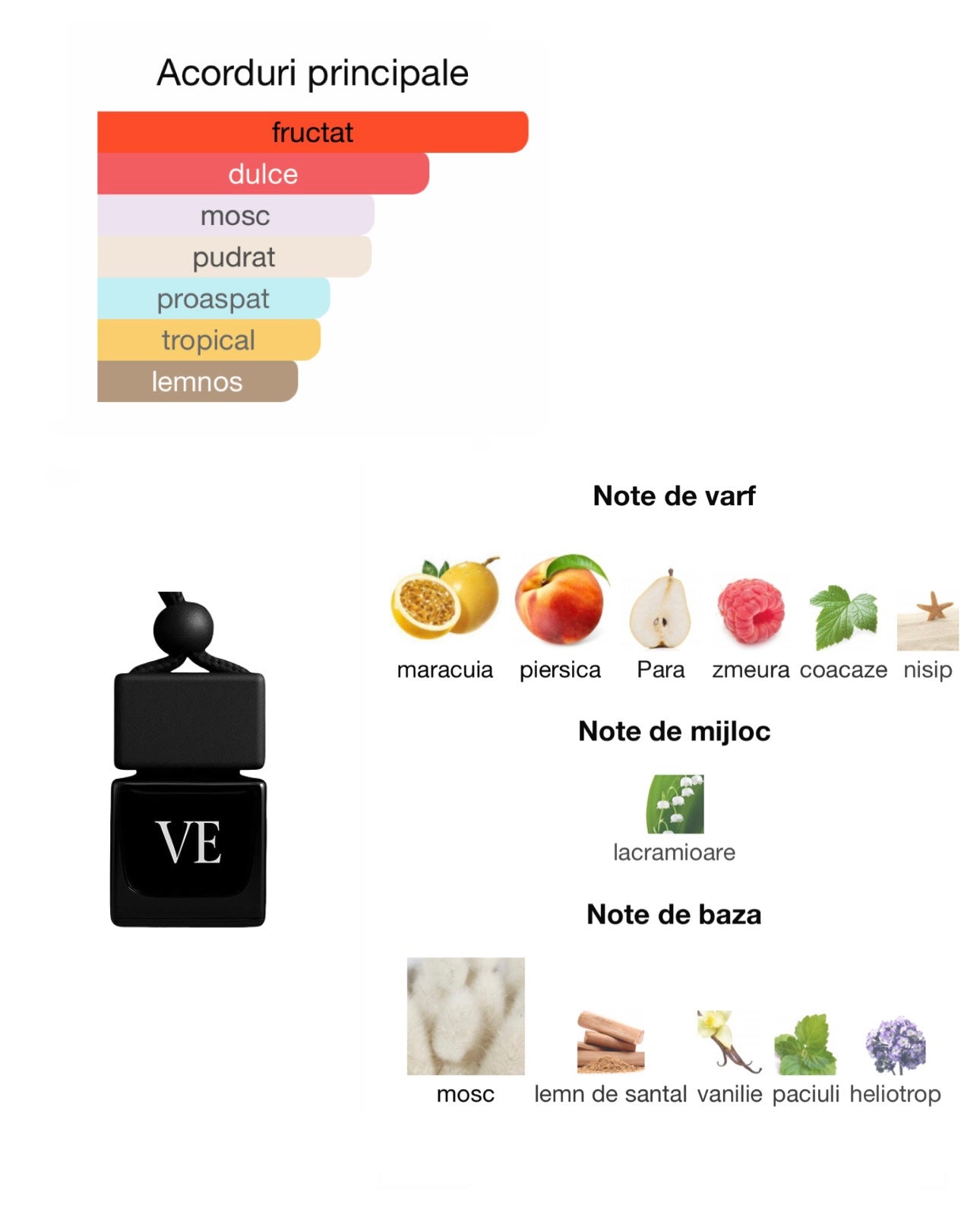Un parfum voluptuos și exotic, construit pe dulceața suculentă a perelor, piersicilor și zmeurei, învăluite în catifelarea vaniliei.